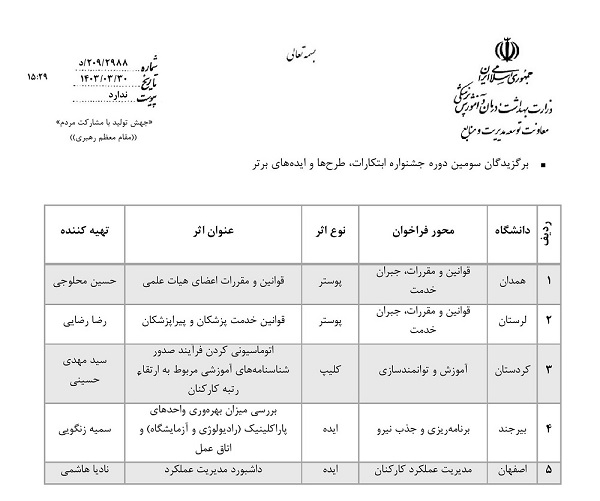 معاونت توسعه مدیریت و منابع دانشگاه با اعلام این خبر افزود طرح برتر همکاران آموزش و توانمندسازی منابع انسانی علوم پزشکی کردستان، دکتر مهدی ذکایی و آقای مهدی حسینی در سومین جشنواره ابتکارات، طرح ها و ایده های برتر منابع انسانی با کسب مقام سوم در سکوی برترین ها ایستاد.